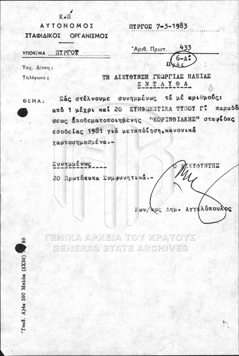 Περιεχόμενα: Αγοραπωλησία σταφίδας. Πίνακες ημερήσιας παραλαβής σταφίδας. Σχετικά με την παραγωγή σταφίδας. Σχετικά με την παραγωγή σ...