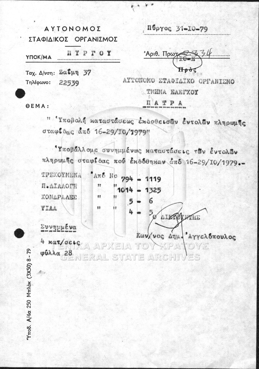 Contents: Αγοραπωλησία σταφίδας. Πίνακες ημερήσιας παραλαβής σταφίδας. Σχετικά με την παραγωγή σταφίδας. Σχετικά με την παραγωγή σ...