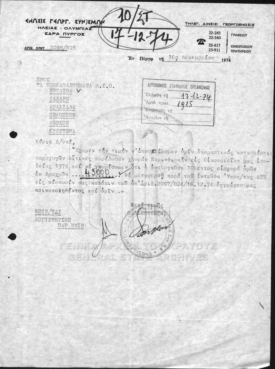 [Φάκελος] GRGSA-ILE_ADM007.01.F000030 Φάκελος #030 - ΙΝΣΤΙΤΟΥΤΟ ΣΤΑΦΙΔΑΣ [1971 - 1988] Περιεχόμενα: Αγοραπωλησία σταφίδας. Πίνακες ημερήσιας παραλαβής σταφίδας. Σχετικά με την παραγωγή σταφίδας. Σχετικά με την παραγωγή σ... |