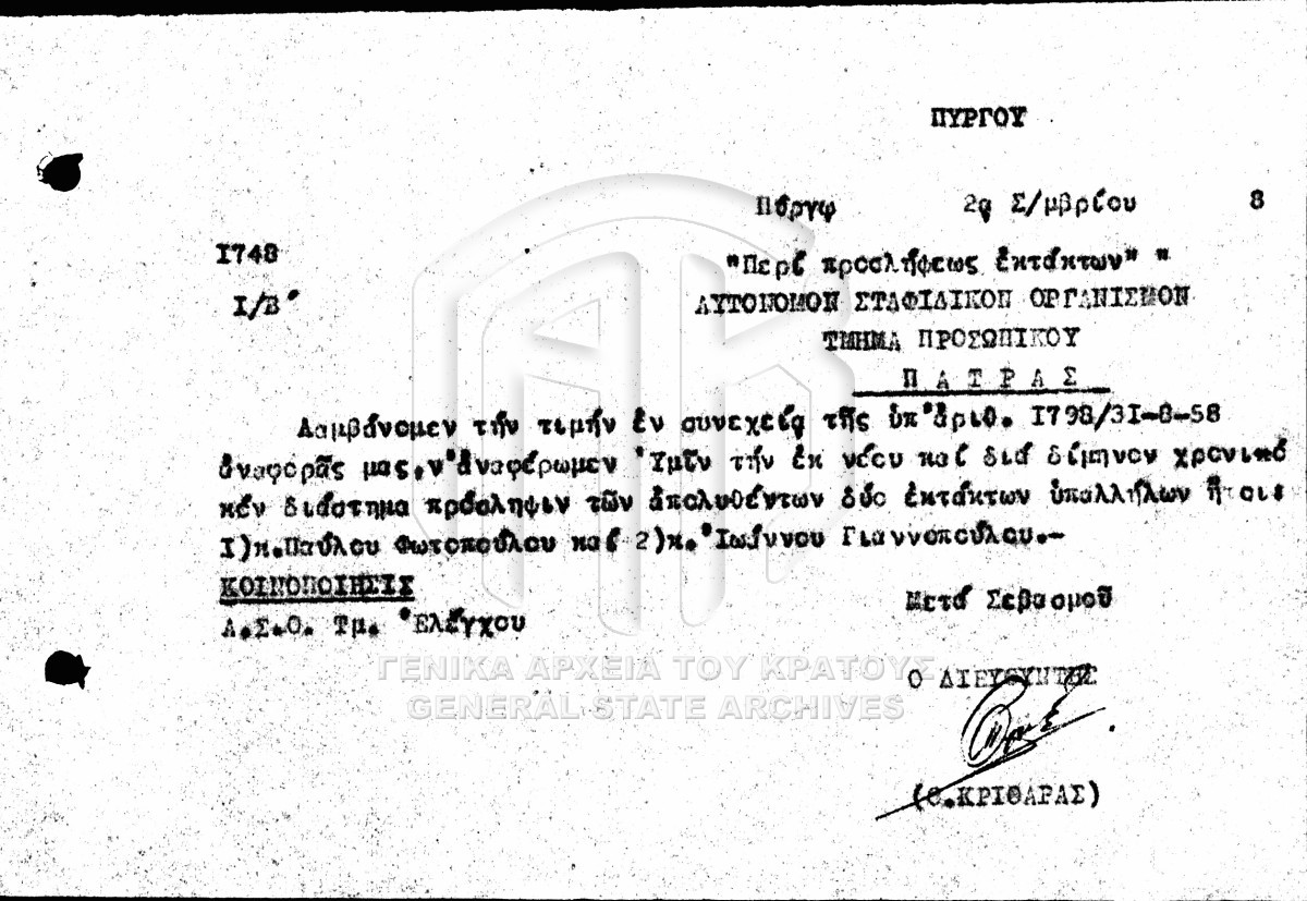 Φάκελος #033 - ΙΝΣΤΙΤΟΥΤΟ ΣΤΑΦΙΔΑΣ / ΑΤΟΜΙΚΟΙ ΦΑΚΕΛΟΙ ΥΠΑΛΛΗΛΩΝ  [1951 - 1967]