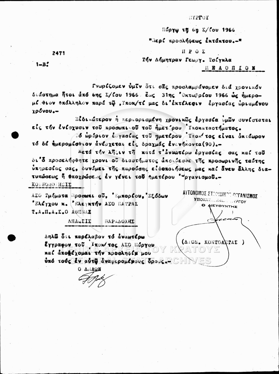Φάκελοι υπαλλήλων. Υπηρεσιακή αλληλογραφία σχετικά με την πρόσληψη υπαλλήλων.