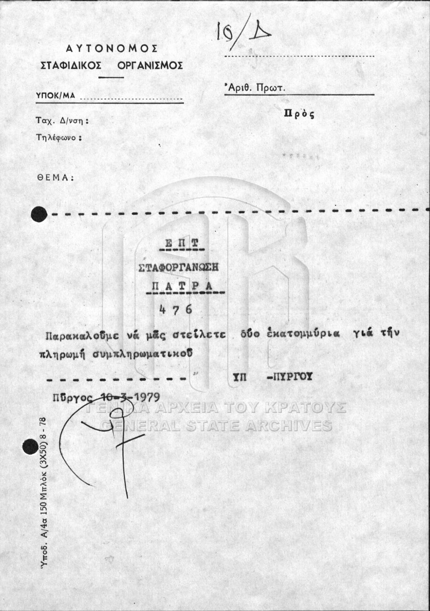 [Φάκελος] GRGSA-ILE_ADM007.01.F000036 Φάκελος #036 - ΙΝΣΤΙΤΟΥΤΟ ΣΤΑΦΙΔΑΣ [1962 - 1985] Περιεχόμενα: Χρεωπίστωση υλικού. Υποβολή καταστάσεων. Πρακτικά και αιτήσεις. Υπηρεσιακή αλληλογραφία. Καταστάσεις αγοράς αγροτικών πρ... |