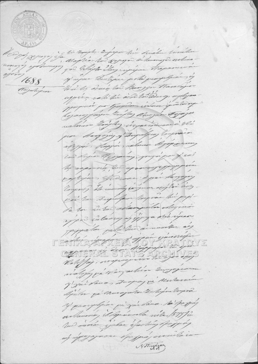 [Τεκμήριο] GRGSA-LAK_NOT023.01.F000005.IT001688 Τεκμήριο #1688 [19 Μαρτίου 1854] Συμβολαιογραφική πράξη. Πωλητήριο. |