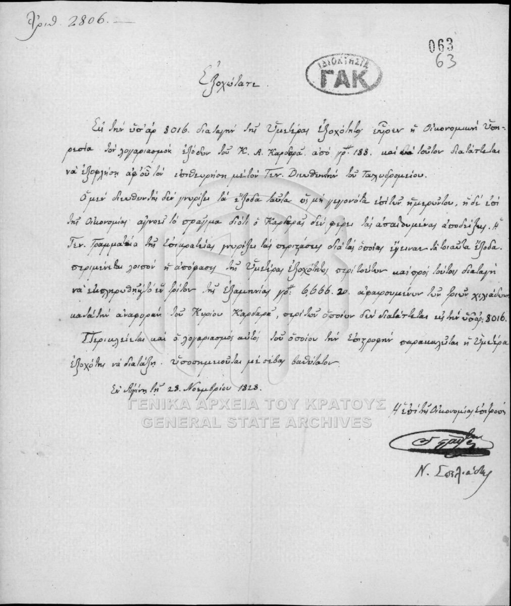 [Αρχείο] GRGSA-CSA_PAK001.00 Αρχείο Γενικής Γραμματείας (περιόδου Κυβερνήτη Ι. Καποδίστρια) [1828 - 1833] Περιέχει επιστολές, αποφάσεις, λογαριασμούς, αναφορές, αποδείξεις, καταλόγους, αιτήσεις, διατάγματα και διάφορα έγγραφα. |