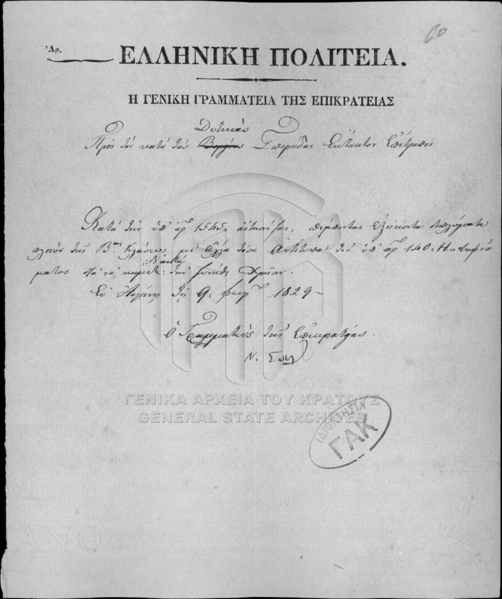 [Fonds] GRGSA-CSA_PAK001.00 Archive of General Secretariat - Archive of General Secretariat [1828 - 1833] Περιέχει επιστολές, αποφάσεις, λογαριασμούς, αναφορές, αποδείξεις, καταλόγους, αιτήσεις, διατάγματα και διάφορα έγγραφα. |