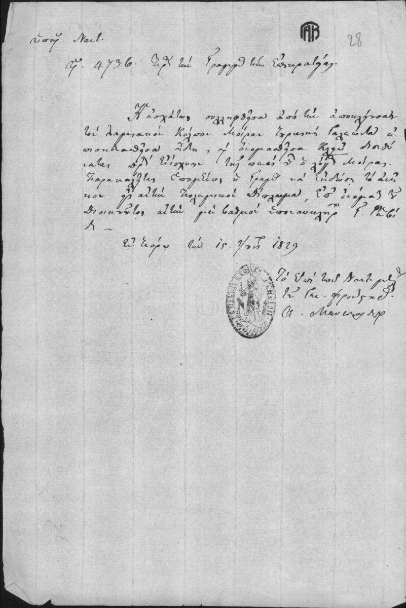 [Fonds] GRGSA-CSA_PAK001.00 Archive of General Secretariat - Archive of General Secretariat [1828 - 1833] Περιέχει επιστολές, αποφάσεις, λογαριασμούς, αναφορές, αποδείξεις, καταλόγους, αιτήσεις, διατάγματα και διάφορα έγγραφα. |
