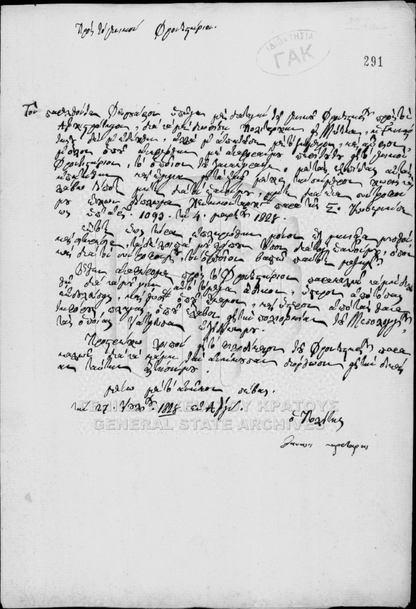 [Fonds] GRGSA-CSA_PAK001.00 Archive of General Secretariat - Archive of General Secretariat [1828 - 1833] Περιέχει επιστολές, αποφάσεις, λογαριασμούς, αναφορές, αποδείξεις, καταλόγους, αιτήσεις, διατάγματα και διάφορα έγγραφα. |