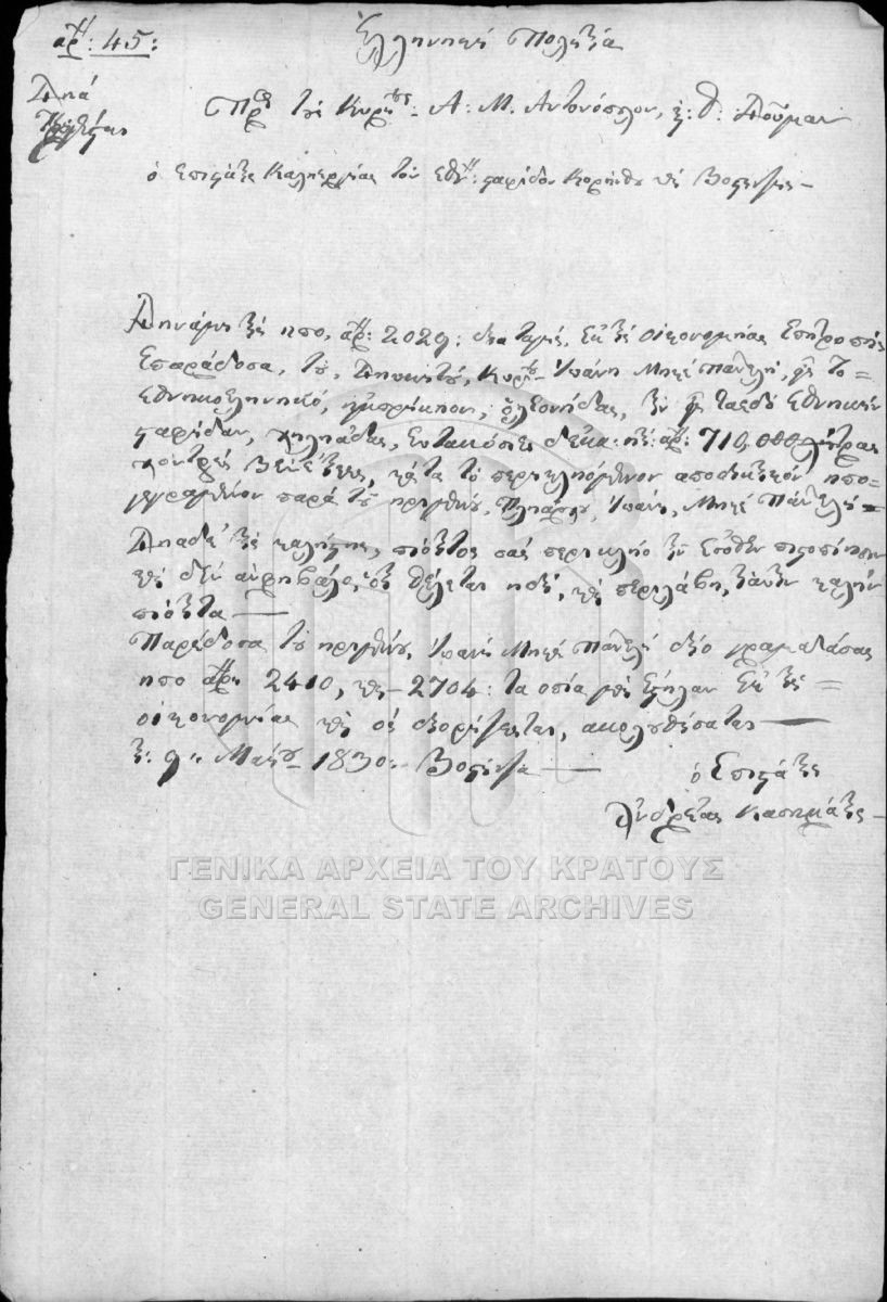 Περιέχει επιστολές, λογαριασμούς, ισολογισμούς, λογιστικές καταστάσεις, αποδείξεις (εισπράξεων και πληρωμών), διαταγές, κατάστιχα, γραμμά...