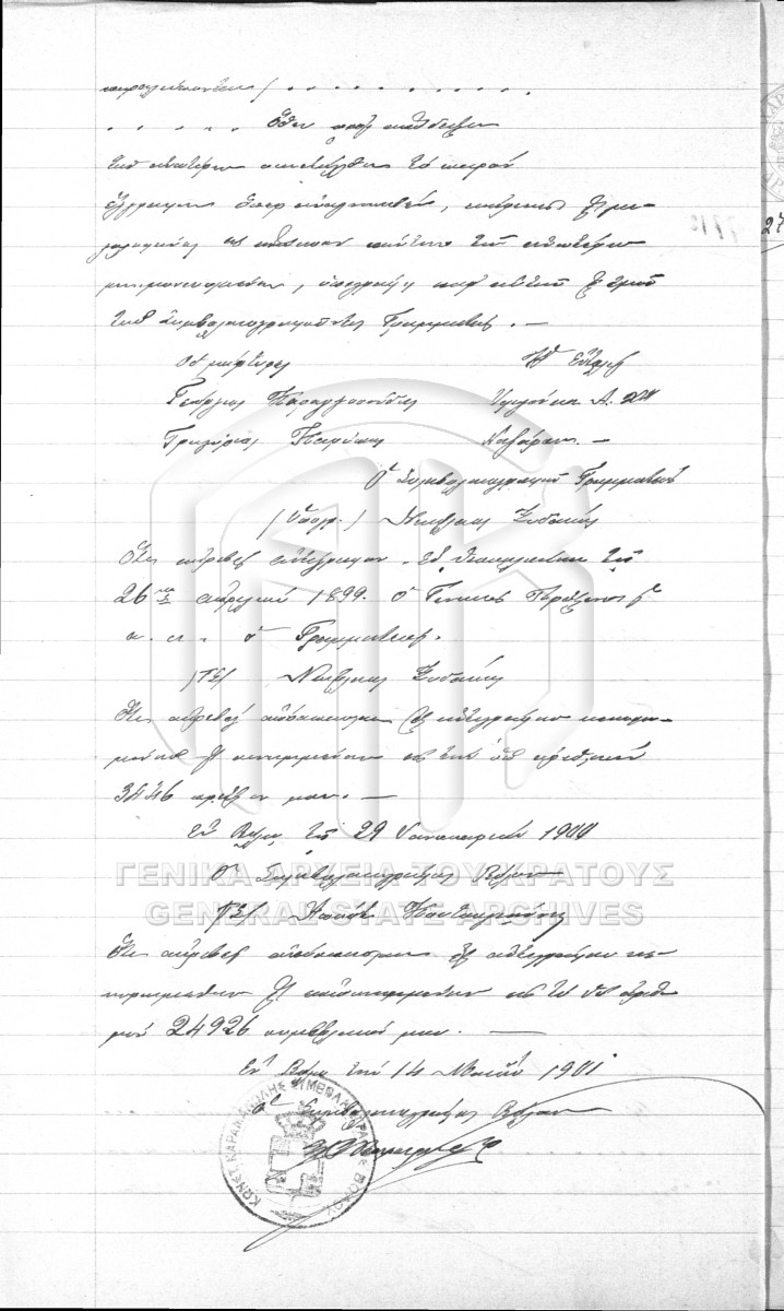 [Pièce] GRGSA-MAG_NOT002.01.F000058.SF0001.IT027712 Pièce #27712 [16 Μαΐου 1901] Συμβολαιογραφική πράξη. Πληρωμή αποζημιώσεως. |