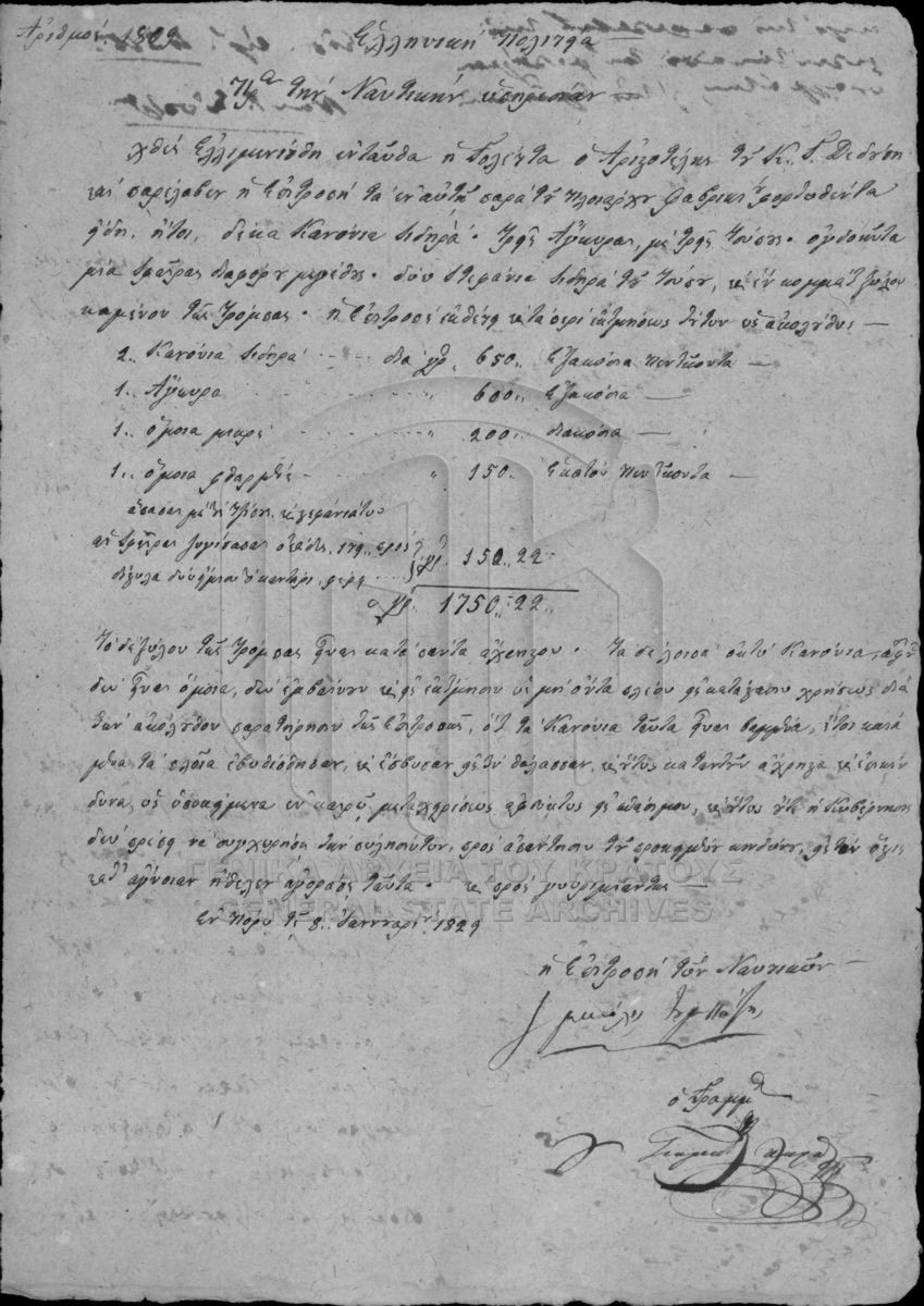 Περιέχει επιστολές, διάφορα έγγραφα, διατάγματα, λογαριασμούς, ονομαστικούς καταλόγους, αποδείξεις, ναυτολόγια και δηλοποιήσεις.