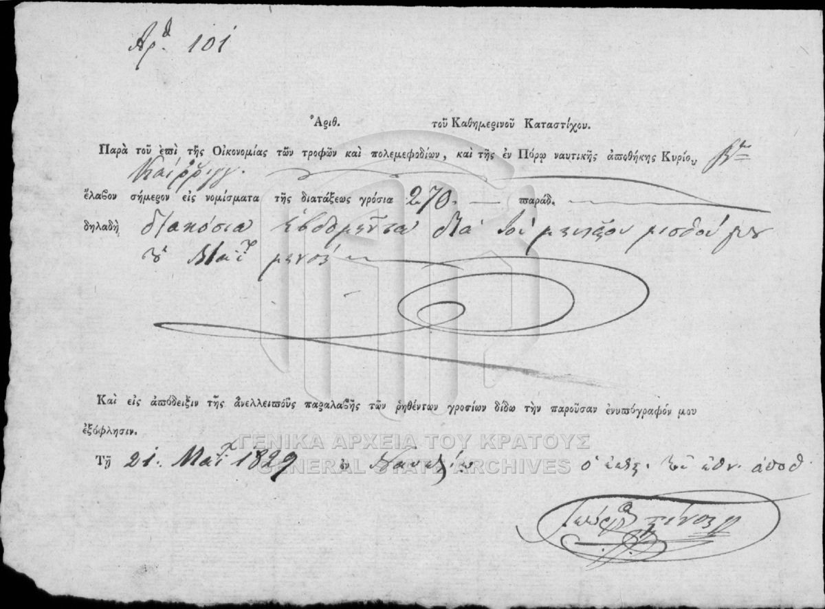 Περιέχει επιστολές, διάφορα έγγραφα, διατάγματα, λογαριασμούς, ονομαστικούς καταλόγους, αποδείξεις, ναυτολόγια και δηλοποιήσεις.