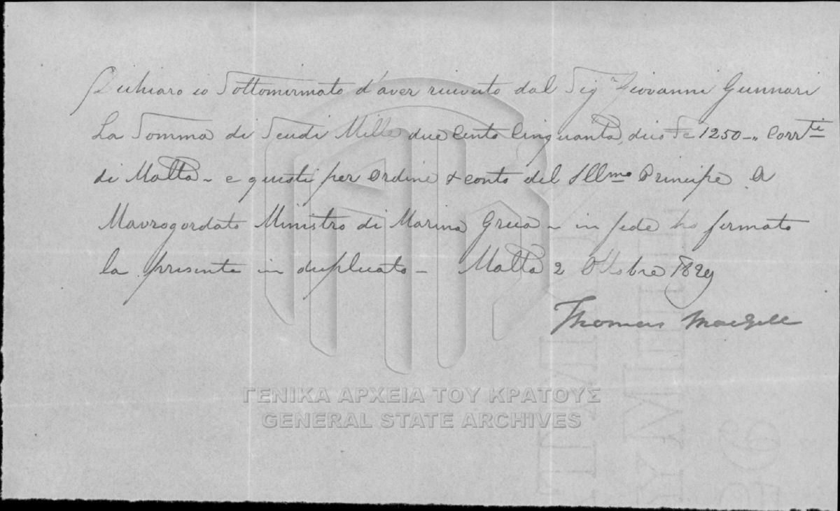 Περιέχει επιστολές, διάφορα έγγραφα, διατάγματα, λογαριασμούς, ονομαστικούς καταλόγους, αποδείξεις, ναυτολόγια και δηλοποιήσεις.