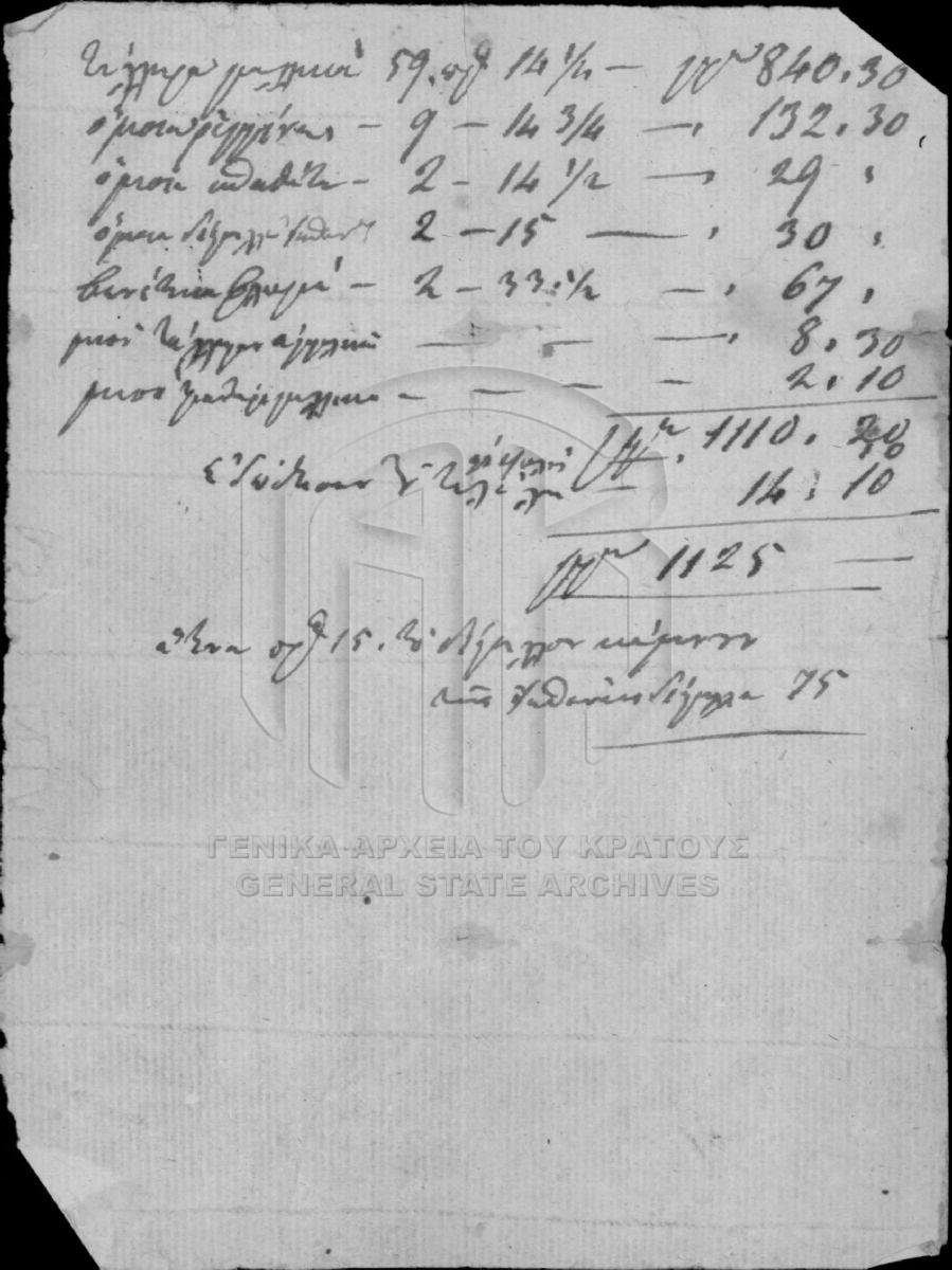 Περιέχει επιστολές, διάφορα έγγραφα, διατάγματα, λογαριασμούς, ονομαστικούς καταλόγους, αποδείξεις, ναυτολόγια και δηλοποιήσεις.