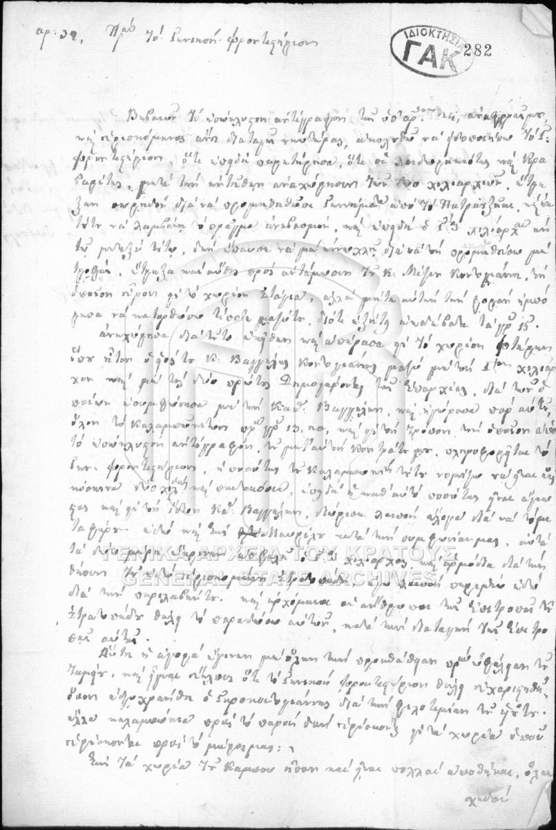 Περιέχει επιστολές, διάφορα έγγραφα, διατάγματα, λογαριασμούς, ονομαστικούς καταλόγους, αποδείξεις, ναυτολόγια και δηλοποιήσεις.