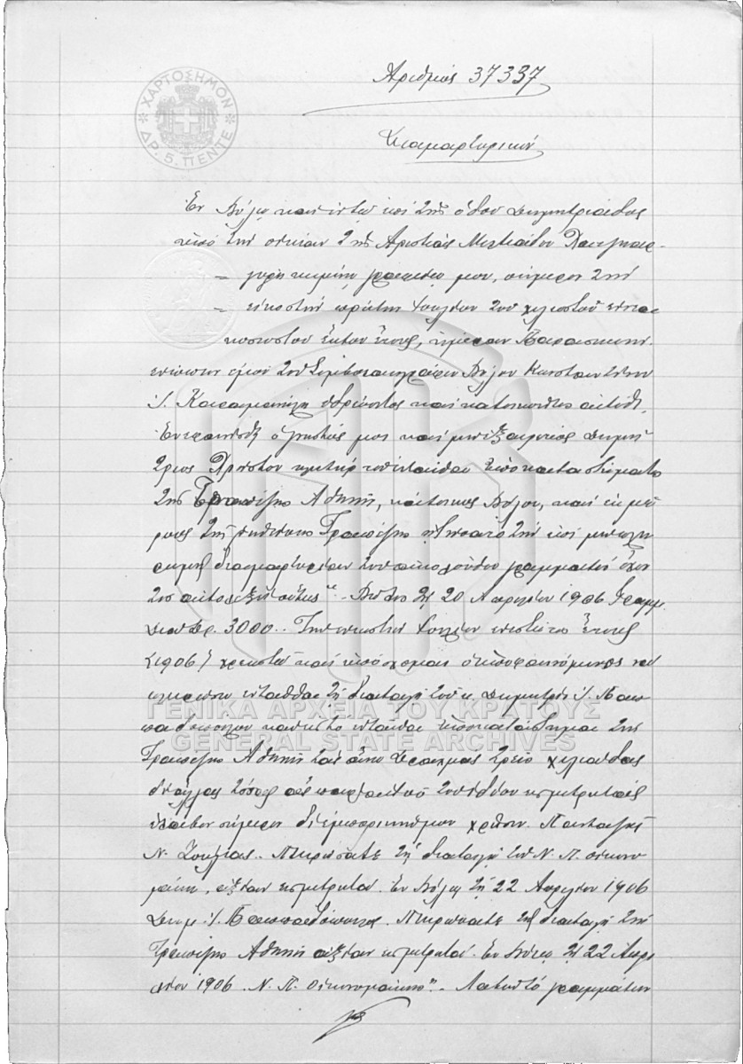 [Item] GRGSA-MAG_NOT002.01.F000075.IT037337 Item #37337 - KARAMANOLIS NOTARIAL ARCHIVE [21 Ιουλίου 1906] Notarial deed. Notice of protest. |