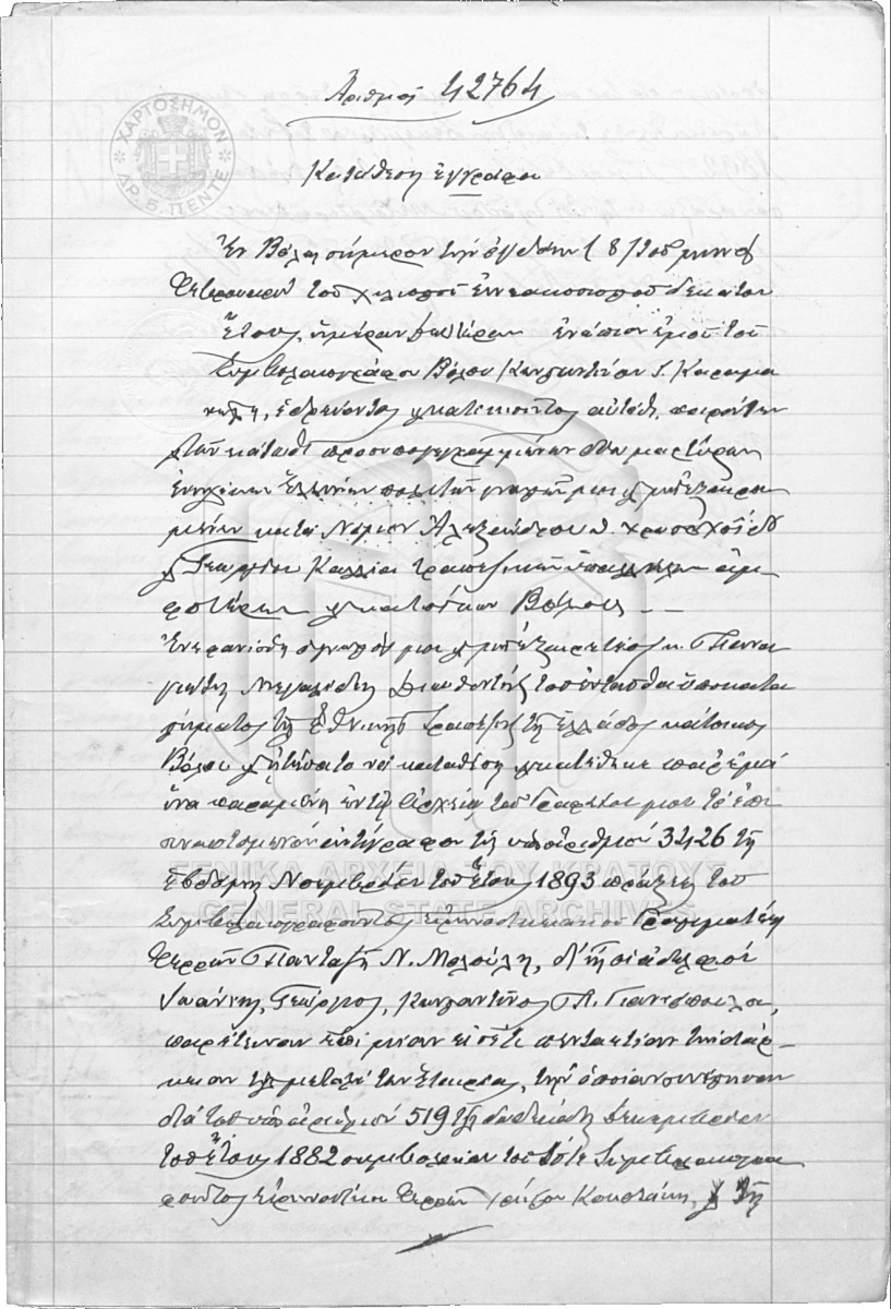 [Pièce] GRGSA-MAG_NOT002.01.F000087.IT042764 Pièce #42764 [8 Φεβρουαρίου 1910] Συμβολαιογραφική πράξη. Κατάθεση εγγράφου. |