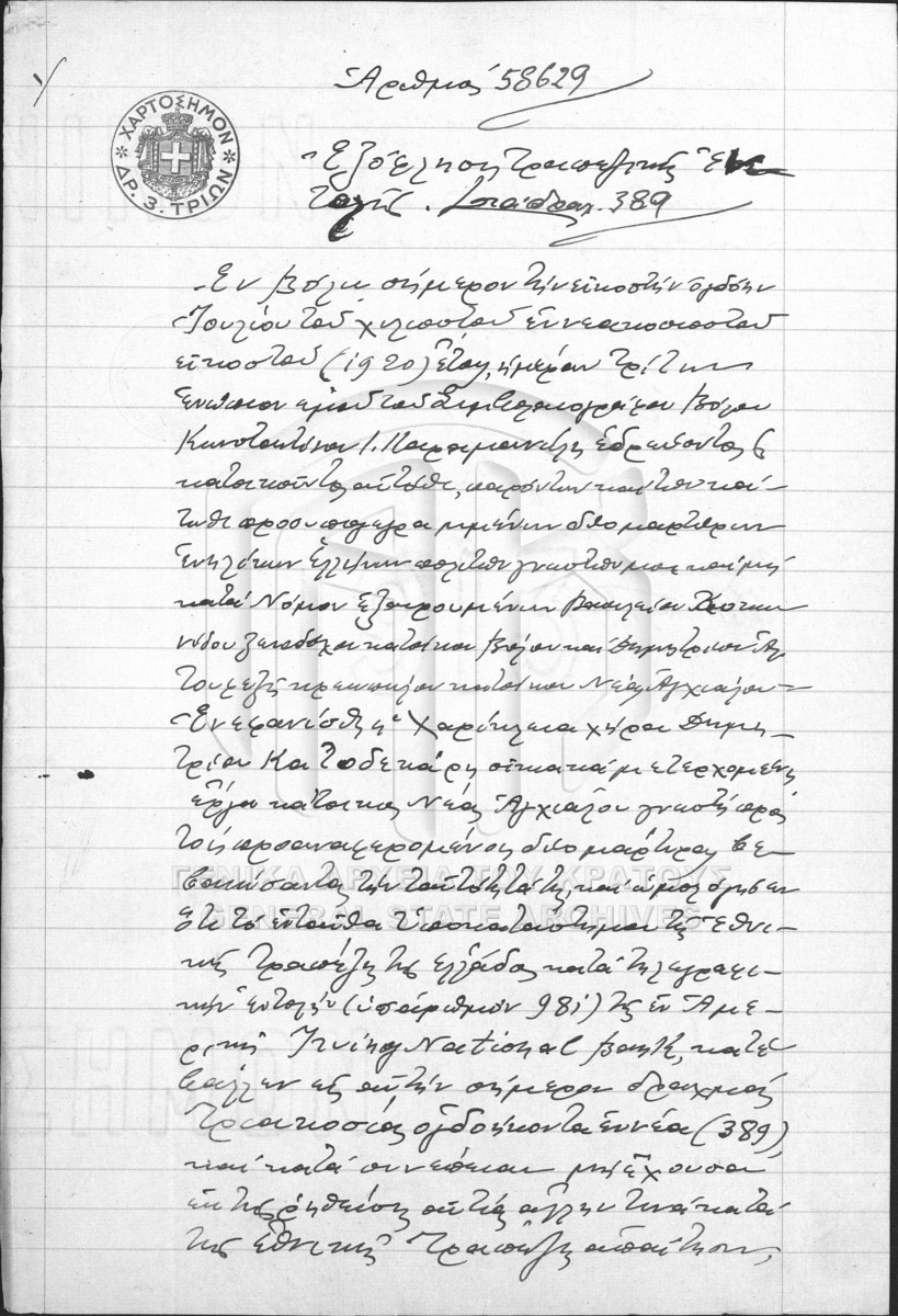 [Item] GRGSA-MAG_NOT002.01.F000113.IT058629 Item #58629 - KARAMANOLIS NOTARIAL ARCHIVE [28 Ιουλίου 1920] Notarial deed. Bank draft payment deed. |