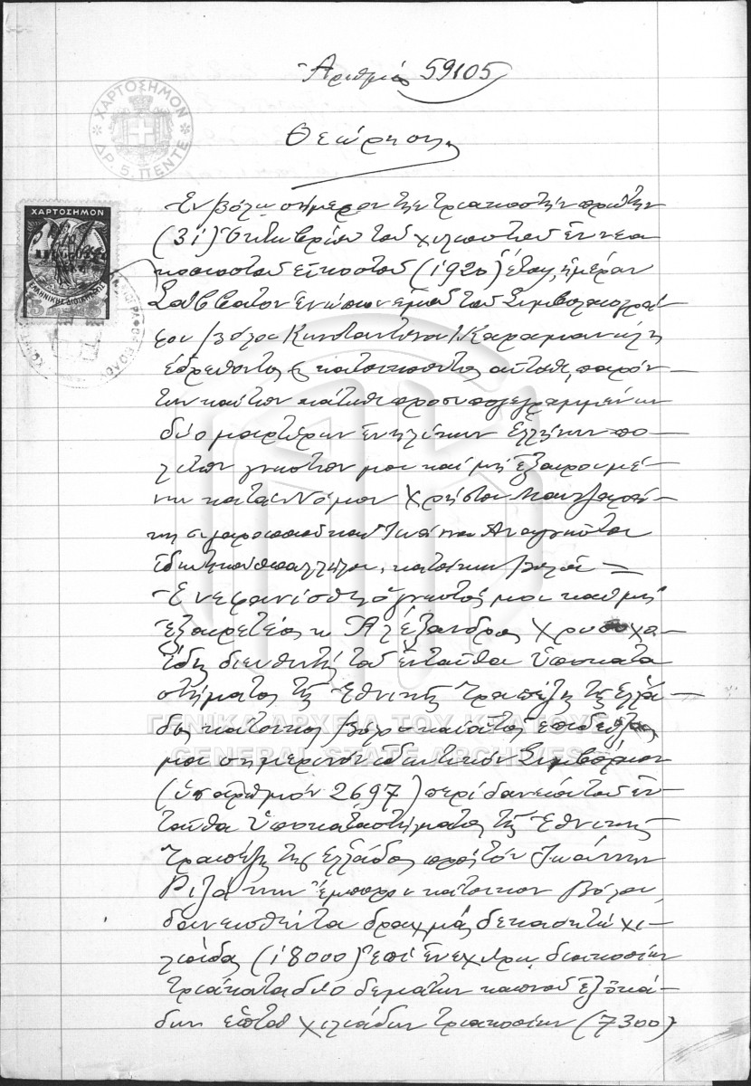 [Τεκμήριο] GRGSA-MAG_NOT002.01.F000114.IT059105 Τεκμήριο #59105 [31 Οκτωβρίου 1920] Συμβολαιογραφική πράξη. Θεώρηση. |
