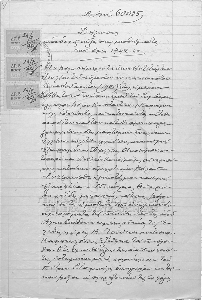 [Pièce] GRGSA-MAG_NOT002.01.F000116.IT060025 Pièce #60025 [24 Ιουλίου 1921] Συμβολαιογραφική πράξη. Δήλωση. |