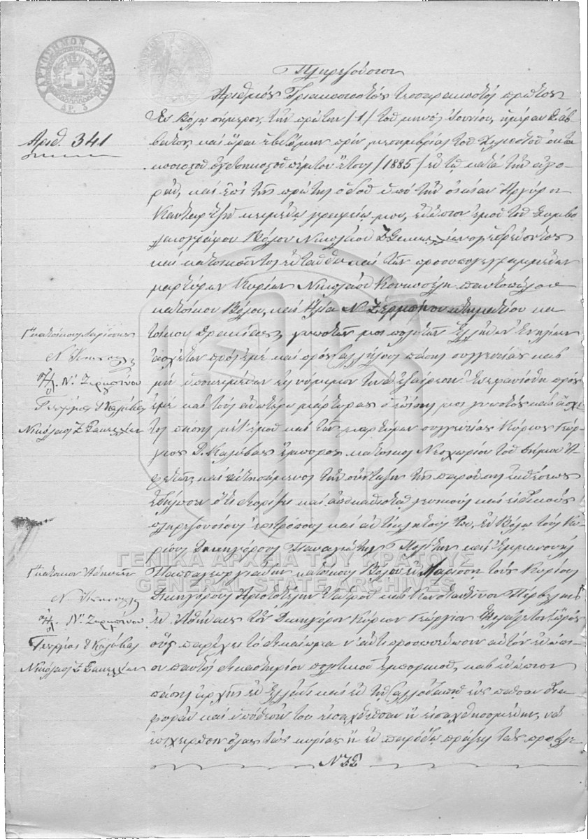 [Τεκμήριο] GRGSA-MAG_NOT004.02.F000001.IT000341 Τεκμήριο #341 [1 Ιουνίου 1885] Συμβολαιογραφική πράξη. Πληρεξούσιο. |