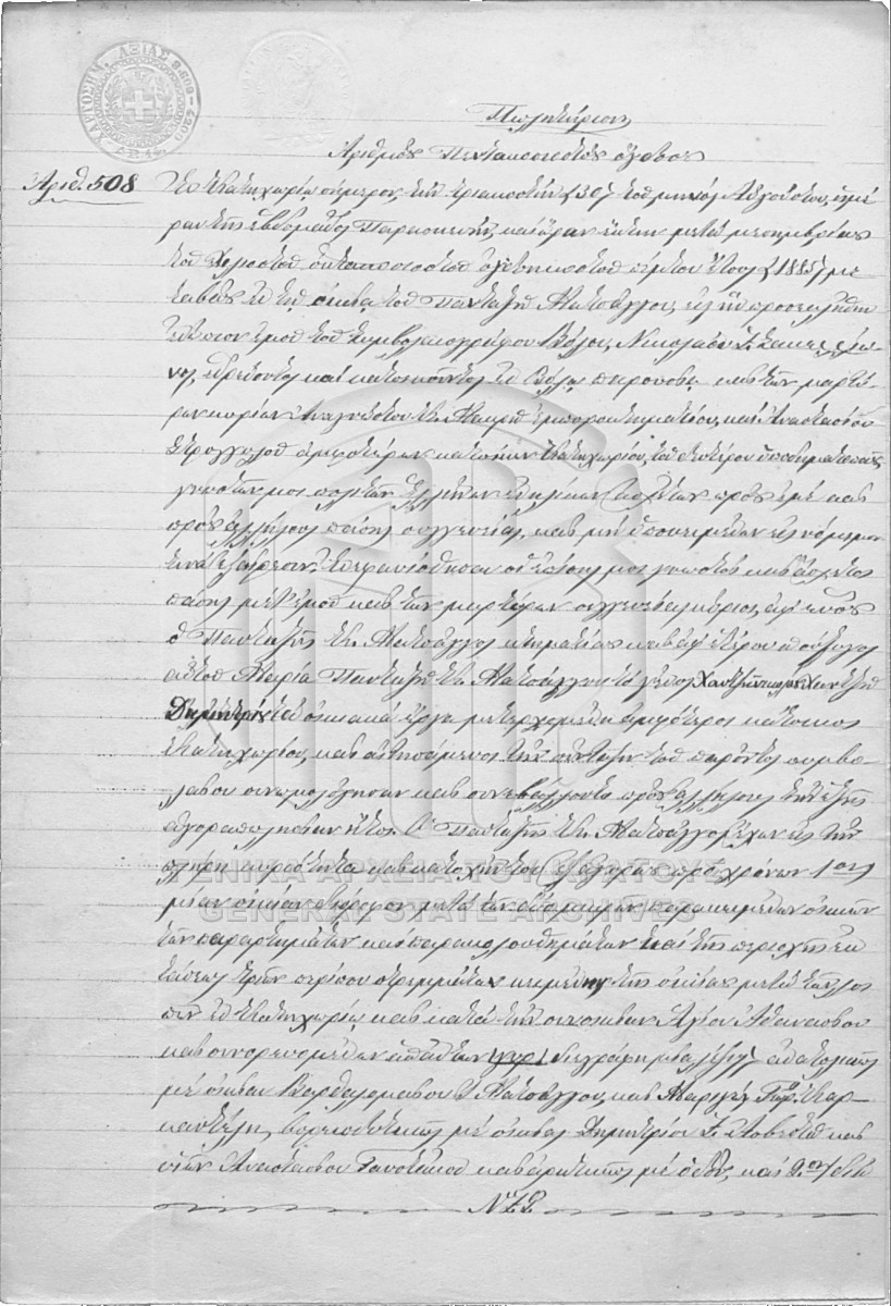 [Pièce] GRGSA-MAG_NOT004.02.F000001.IT000508 Pièce #508 [30 Αυγούστου 1885] Συμβολαιογραφική πράξη. Πωλητήριο. |
