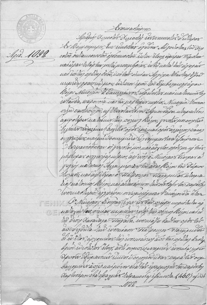 [Item] GRGSA-MAG_NOT004.02.F000002.IT001092 Item #1092 - NIKOLAOS SAKELLION NOTARIAL ARCHIVE [28 Αυγούστου 1886] Notarial deed. Lease. |
