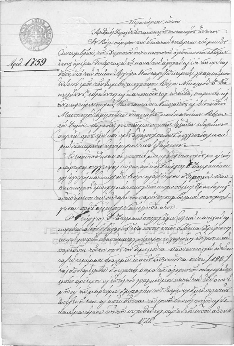 [Item] GRGSA-MAG_NOT004.02.F000004.IT001759 Item #1759 - NIKOLAOS SAKELLION NOTARIAL ARCHIVE [14 Οκτωβρίου 1887] Notarial deed. Horse sale agreement. |