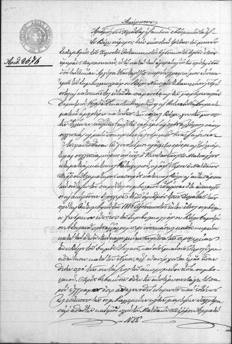 [Pièce] GRGSA-MAG_NOT004.02.F000007.IT002676 Pièce #2676 [23 Σεπτεμβρίου 1888] Συμβολαιογραφική πράξη. Ακύρωση του υπ' αριθμόν 3000 συμβολαίου της 1ης Οκτωβρίου του 1886. |