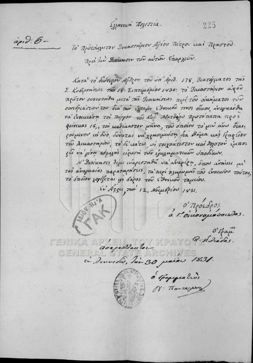 Αρχείο Μινιστέριου/Γραμματείας/Υπουργείου του Δικαίου (περιόδου Κυβερνήτη Ι. Καποδίστρια)  [1828 - 1832]