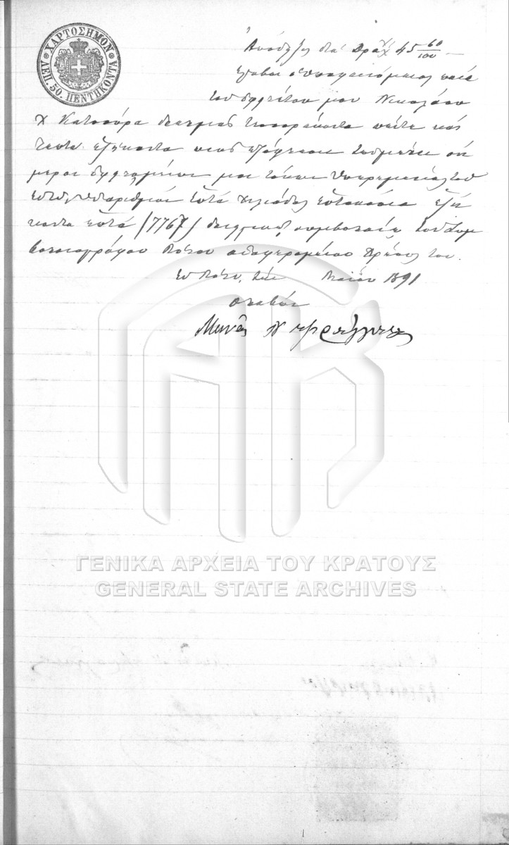 [Item] GRGSA-MAG_NOT026.00.F000047.IT014033 Item #14033 - KON. VLACHONIKOPOULOS NOTARIAL ARCHIVE ( IOANNIS GALLEAS NOTARIAL COLLECTION) [24 Μαΐου 1891] Notarial deed. Contract payment deed. |