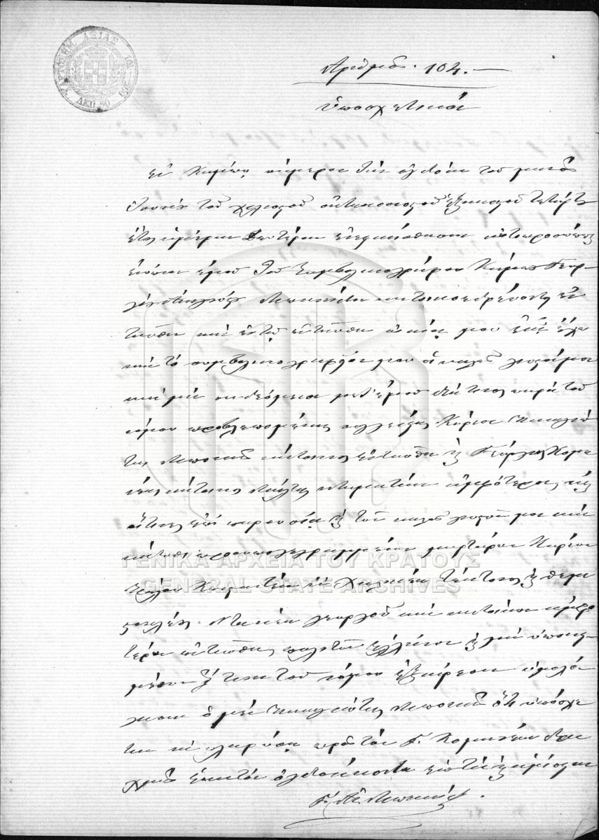 [Τεκμήριο] GRGSA-MES_NOT128.01.F000008.IT000104 Τεκμήριο #104 - ΣΥΜΒΟΛΑΙΟΓΡΑΦΙΚΟ ΑΡΧΕΙΟ ΑΒΙΑΣ [8 Ιουνίου 1864] Συμβολαιογραφική πράξη. Υποσχετικό. |