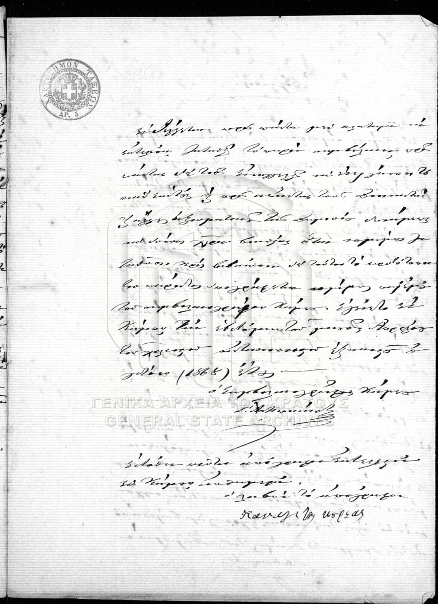 [Pièce] GRGSA-MES_NOT128.01.F000011.IT001231 Pièce #1231 - ΣΥΜΒΟΛΑΙΟΓΡΑΦΙΚΟ ΑΡΧΕΙΟ ΑΒΙΑΣ [23 Δεκεμβρίου 1865] Συμβολαιογραφική πράξη. Συμφωνητικό και κατάργηση δίκης. |