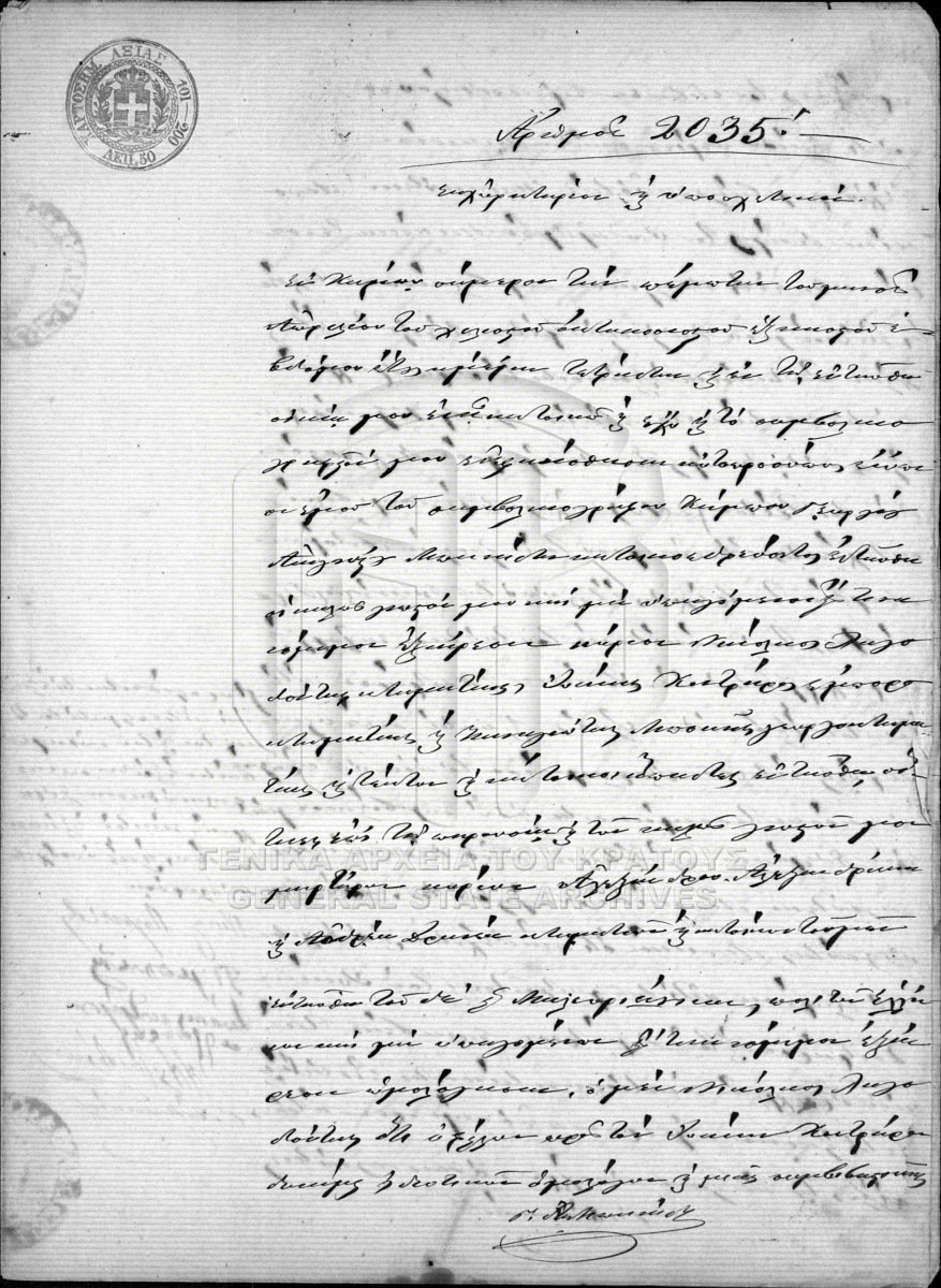 [Pièce] GRGSA-MES_NOT128.01.F000013.IT002035 Pièce #2035 - ΣΥΜΒΟΛΑΙΟΓΡΑΦΙΚΟ ΑΡΧΕΙΟ ΑΒΙΑΣ [5 Απριλίου 1867] Συμβολαιογραφική πράξη. Εκχωρητήριο και υποσχετικό. |