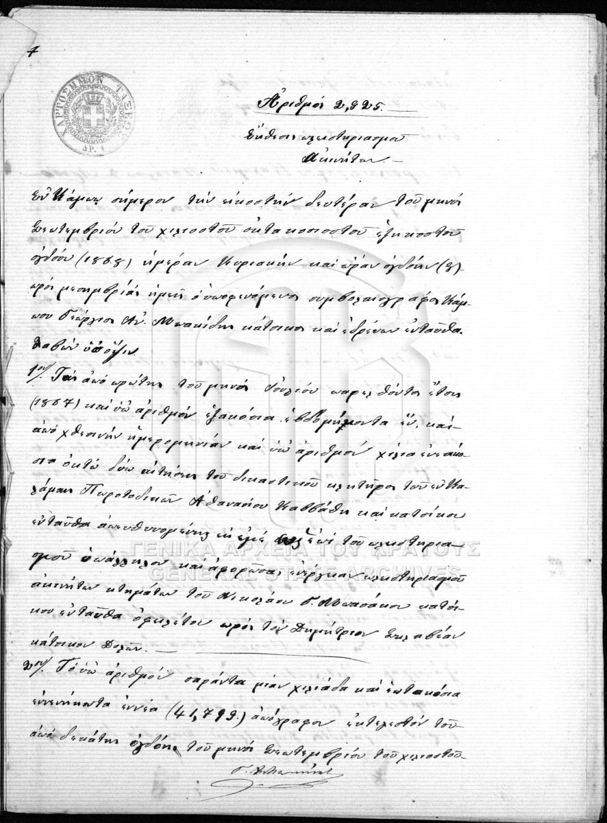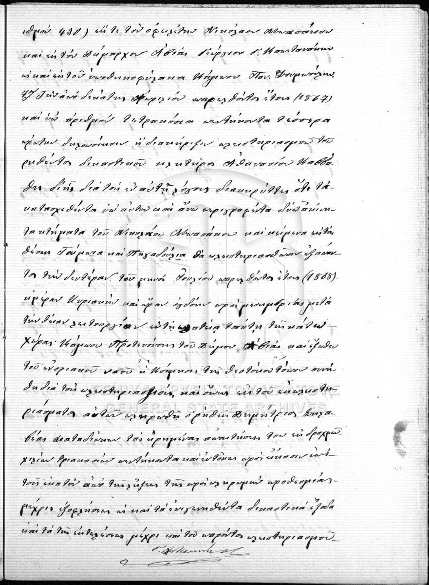 [Pièce] GRGSA-MES_NOT128.01.F000016.IT002965 Pièce #2965 - ΣΥΜΒΟΛΑΙΟΓΡΑΦΙΚΟ ΑΡΧΕΙΟ ΑΒΙΑΣ [20 Οκτωβρίου 1868] Συμβολαιογραφική πράξη. Έκθεση κατακυρωτική πλειστηριαμού ακινήτων. |