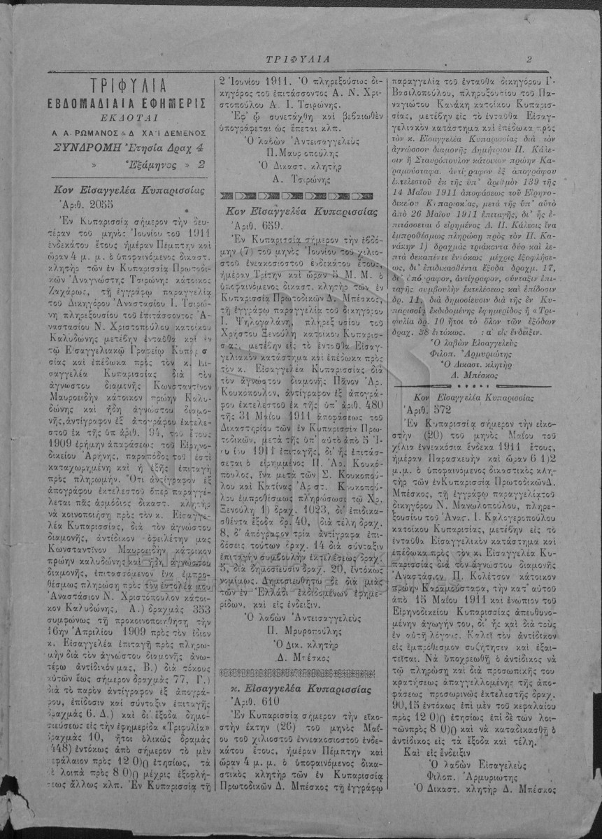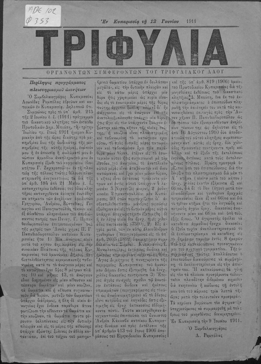 ΑΡΧΕΙΟ ΕΦΗΜΕΡΙΔΑΣ ΚΥΠΑΡΙΣΣΙΑΣ "ΤΡΙΦΥΛΙΑ"  [1908-1913]