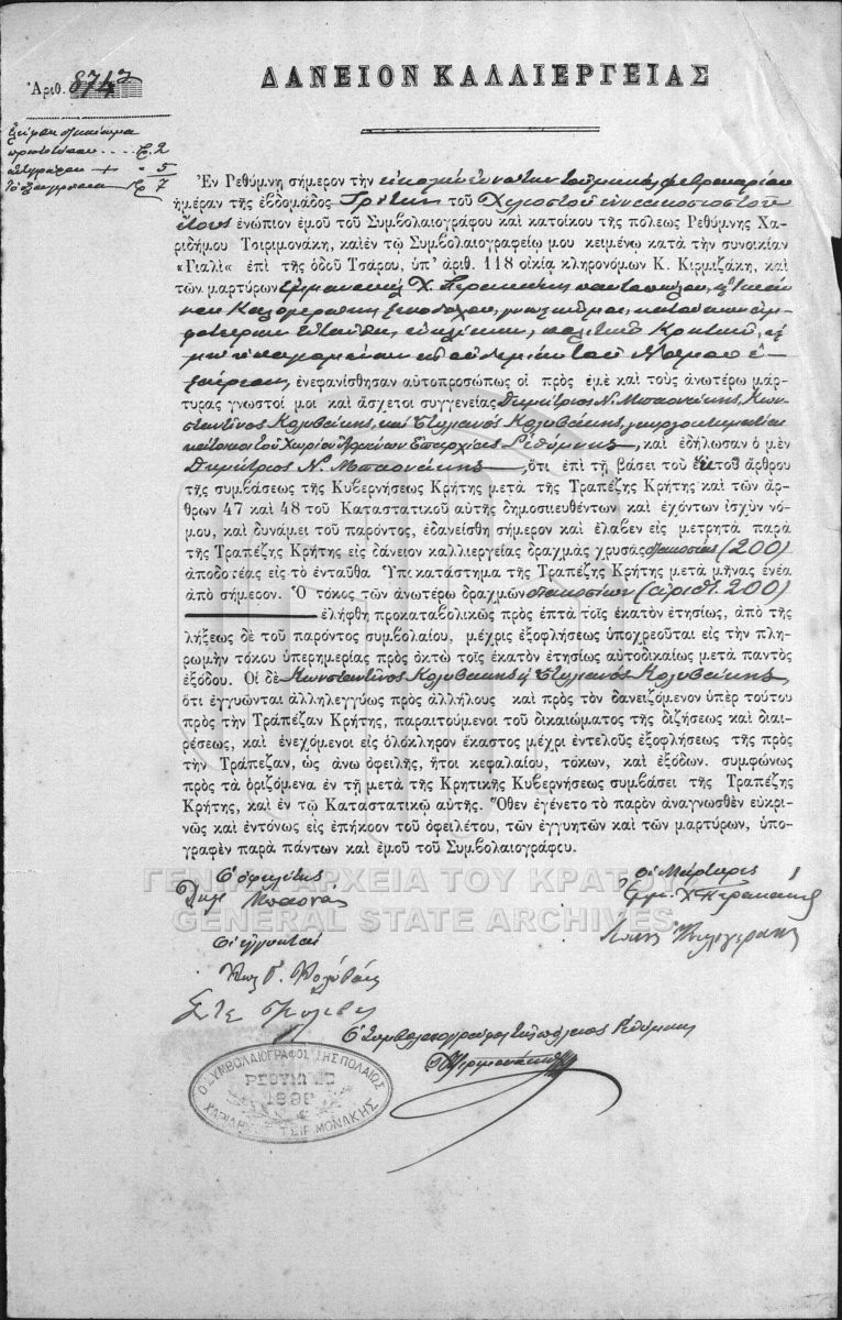 [Pièce] GRGSA-RET_NOT002.01.F000014.IT000874 Pièce #874 [29 Φεβρουαρίου 1900] Συμβολαιογραφική πράξη. Δάνειο καλλιέργειας. |