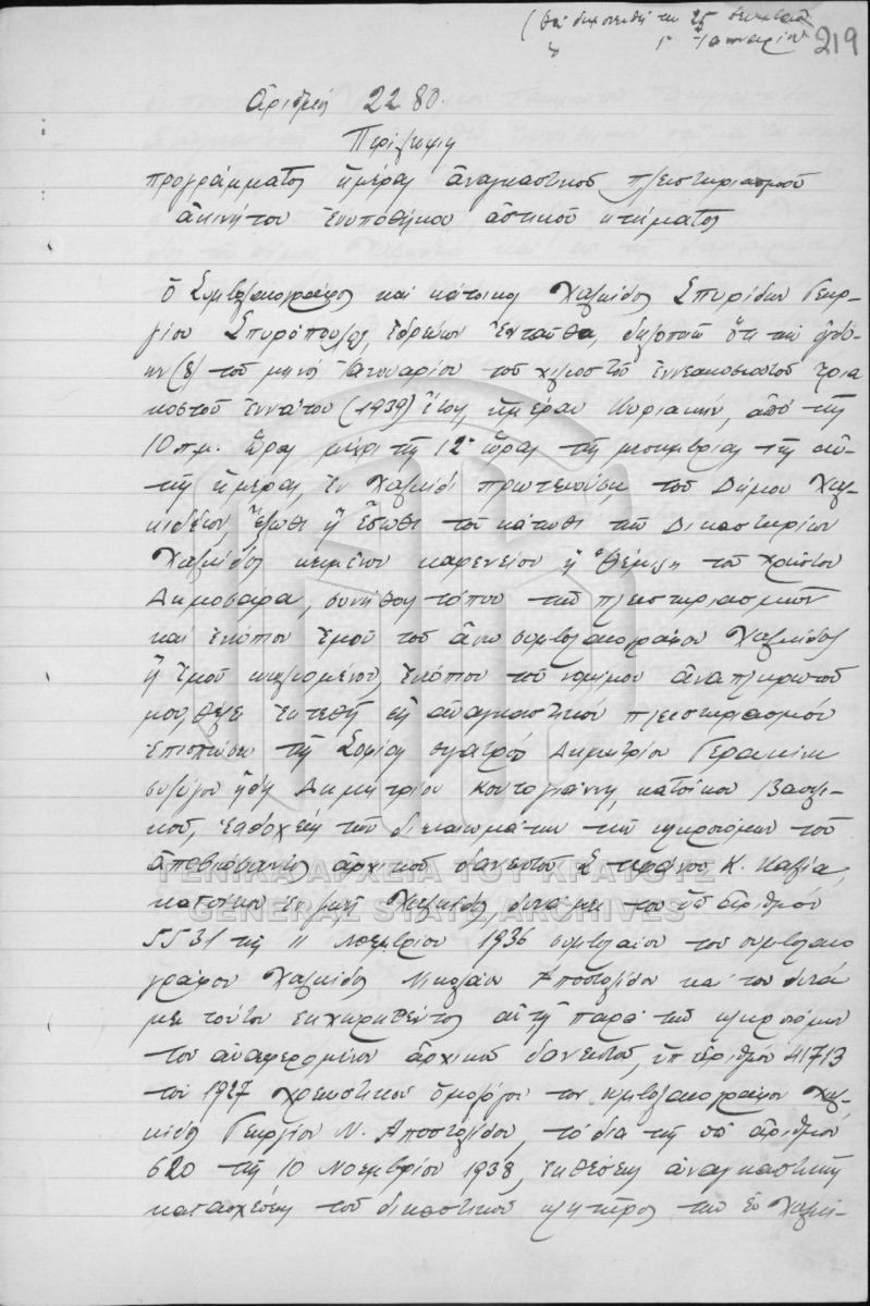 [Item] GRGSA-EUB_NOT001.10.01.F000005.SF0002.IT002280 Item #2280 [8 Ιανουαρίου 1939] Συμβολαιογραφική πράξη. Περίληψη προγράμματος ημέρας αναγκαστικού πλειστηριασμού ακινήτου ενυποθήκου αστικού κτήματος. |