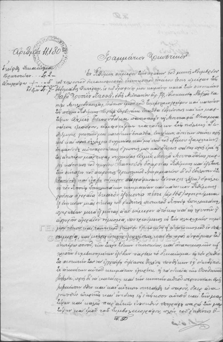 [Pièce] GRGSA-RET_NOT012.01.F000003.IT011180 Pièce #11180 [1 Νοεμβρίου 1899] Συμβολαιογραφική πράξη. Χρεωστικό γραμμάτιο. |