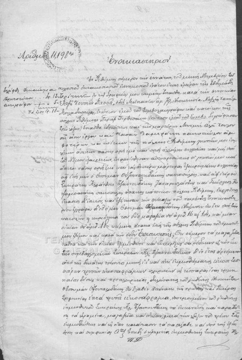 [Pièce] GRGSA-RET_NOT012.01.F000003.IT011198 Pièce #11198 [9 Νοεμβρίου 1899] Συμβολαιογραφική πράξη. Ενοικιαστήριο. |