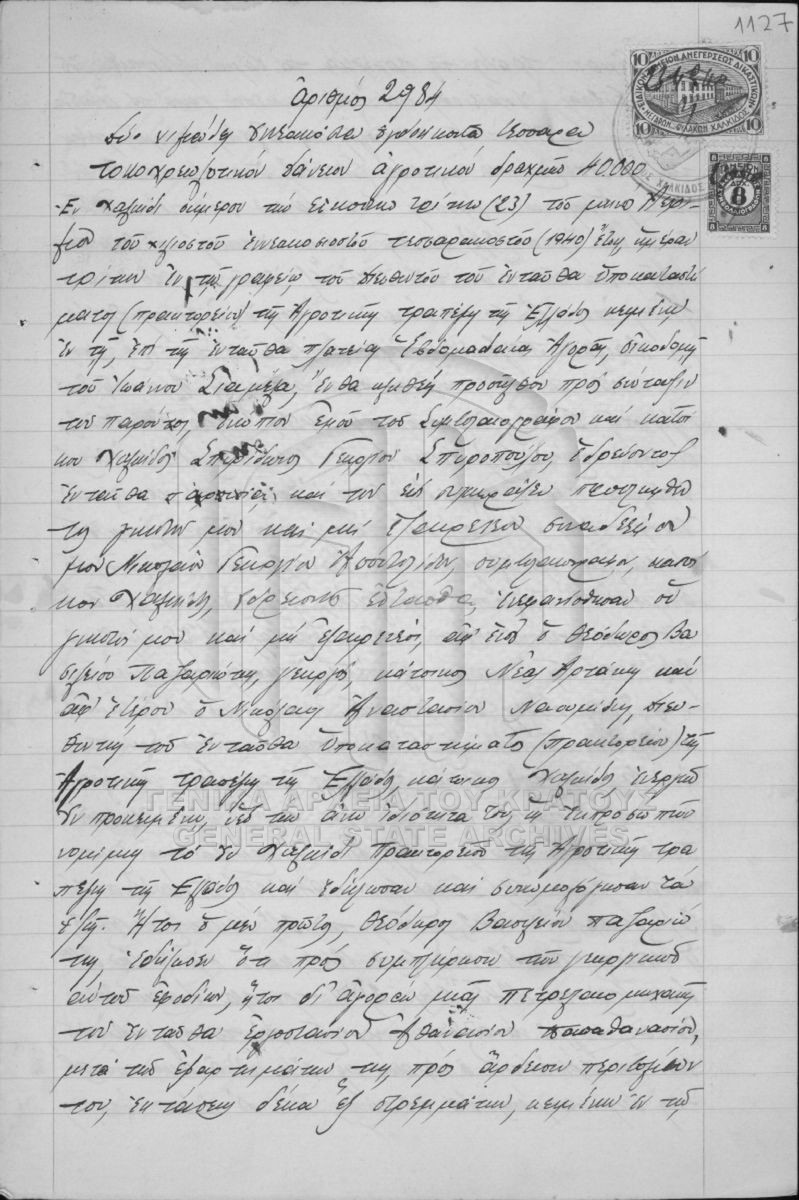 [Τεκμήριο] GRGSA-EUB_NOT001.10.01.F000006.SF0002.IT002984 Τεκμήριο #2984 [23 Απριλίου 1940] Συμβολαιογραφική πράξη. Τοκοχρεωλυτικό δάνειο αγροτικό. |