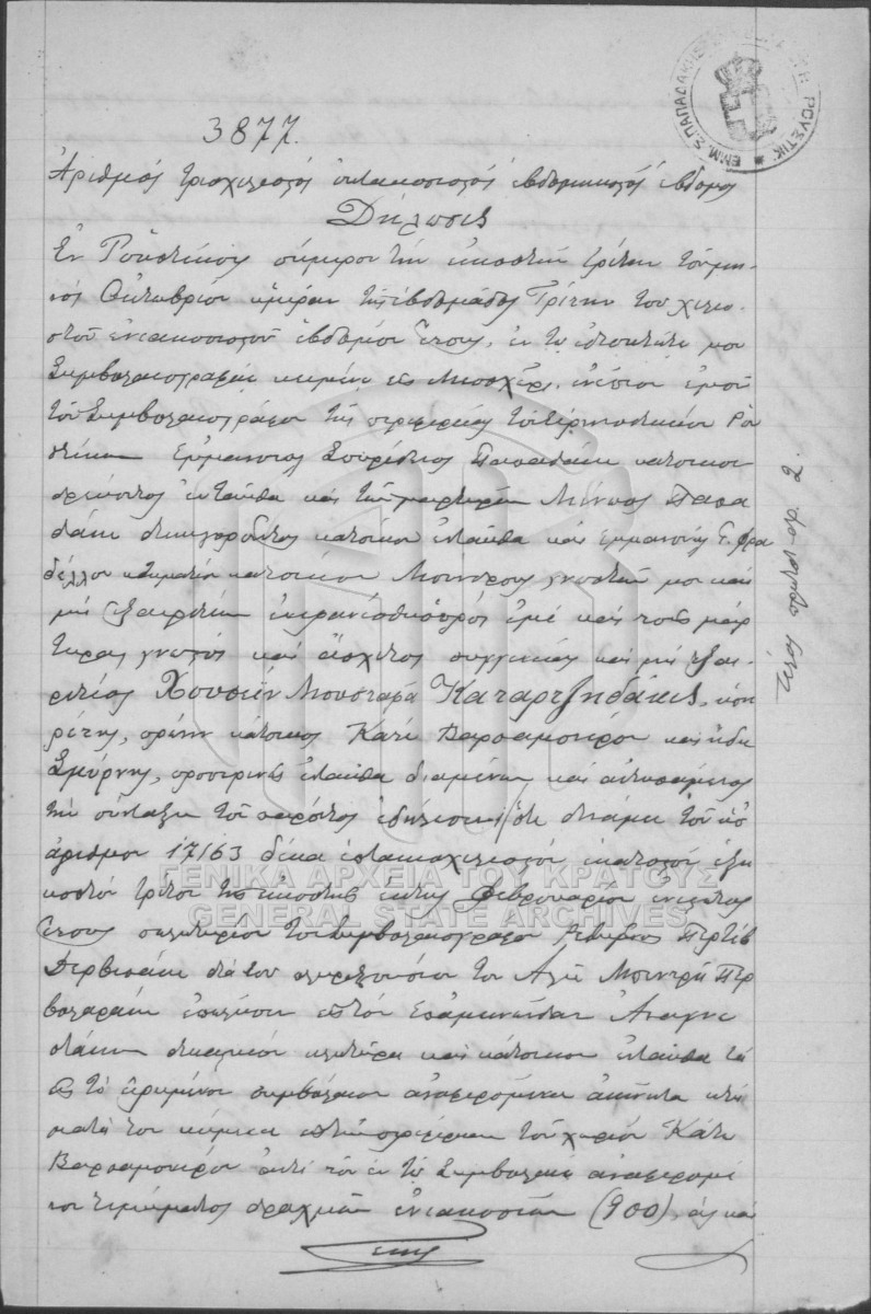 [Pièce] GRGSA-RET_NOT013.01.F000027.IT003877 Pièce #3877 [23 Οκτωβρίου 1907] Συμβολαιογραφική πράξη. Δήλωση. |