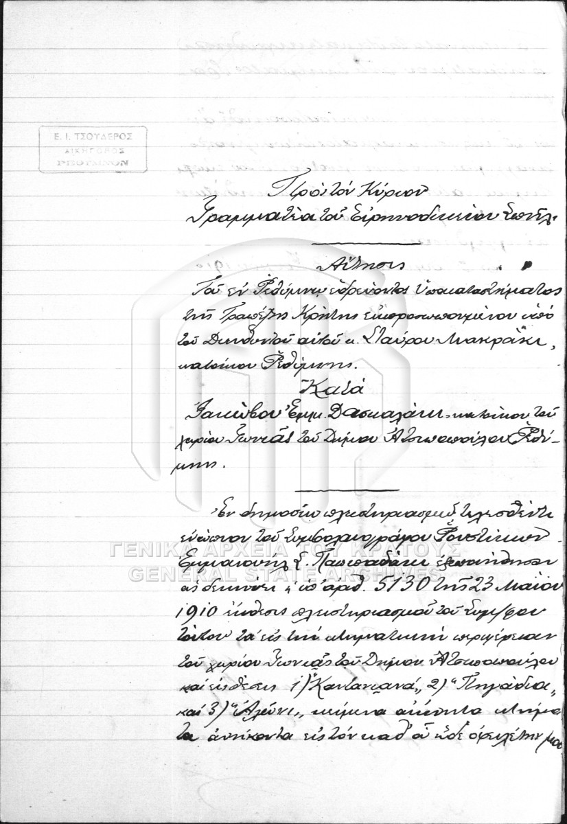 [Fichier] GRGSA-RET_NOT014.01.F000011 Fichier #011 [1908 - 1910] Contenu: Συμβολαιογραφική πράξη. Ανάληψη χρέους. Συμβολαιογραφική πράξη. Εντολή. Συμβολαιογραφική πράξη. Έκθεση πλειστηριασμού. Σ... |