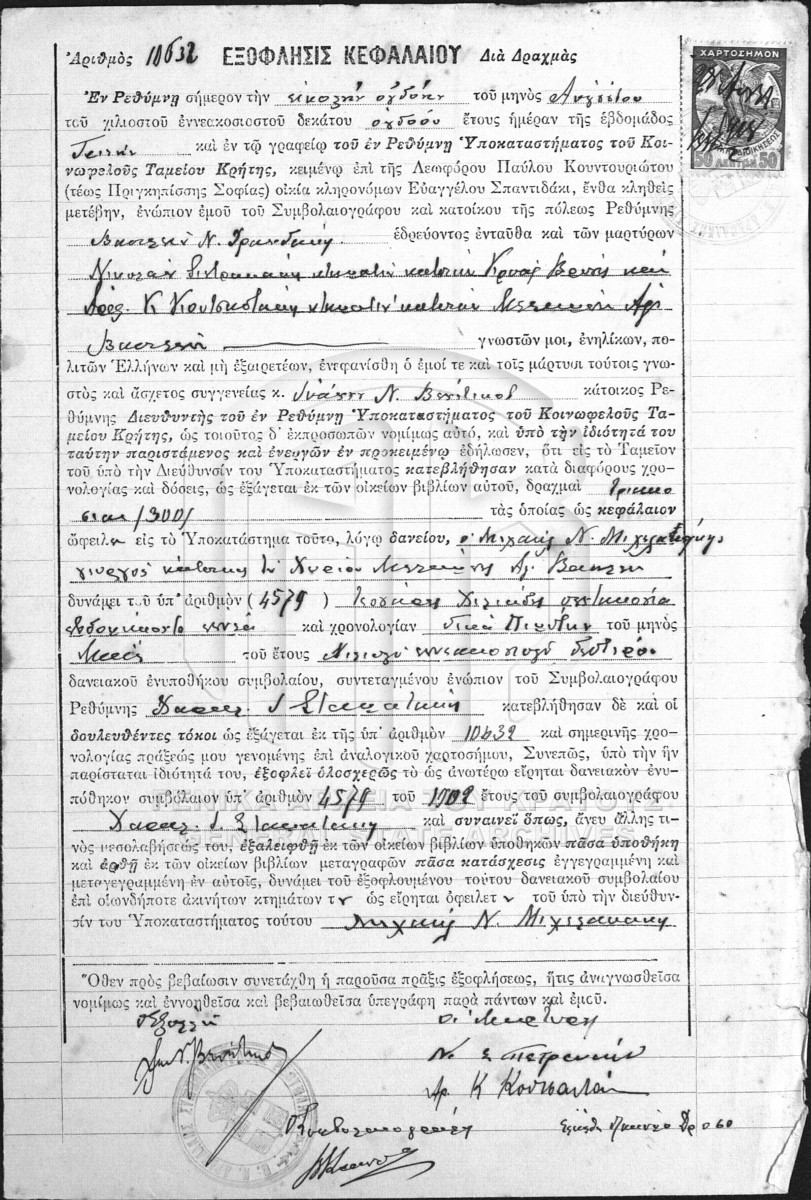 [Pièce] GRGSA-RET_NOT014.01.F000021.IT10632a Pièce #10632a [28 Αυγούστου 1918] Συμβολαιογραφική πράξη. Εξόφληση κεφαλαίου. |