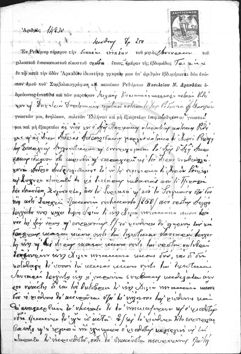 [Pièce] GRGSA-RET_NOT014.01.F000027.IT014230 Pièce #14230 [19 Ιανουαρίου 1921] Συμβολαιογραφική πράξη. Μίσθωση. |
