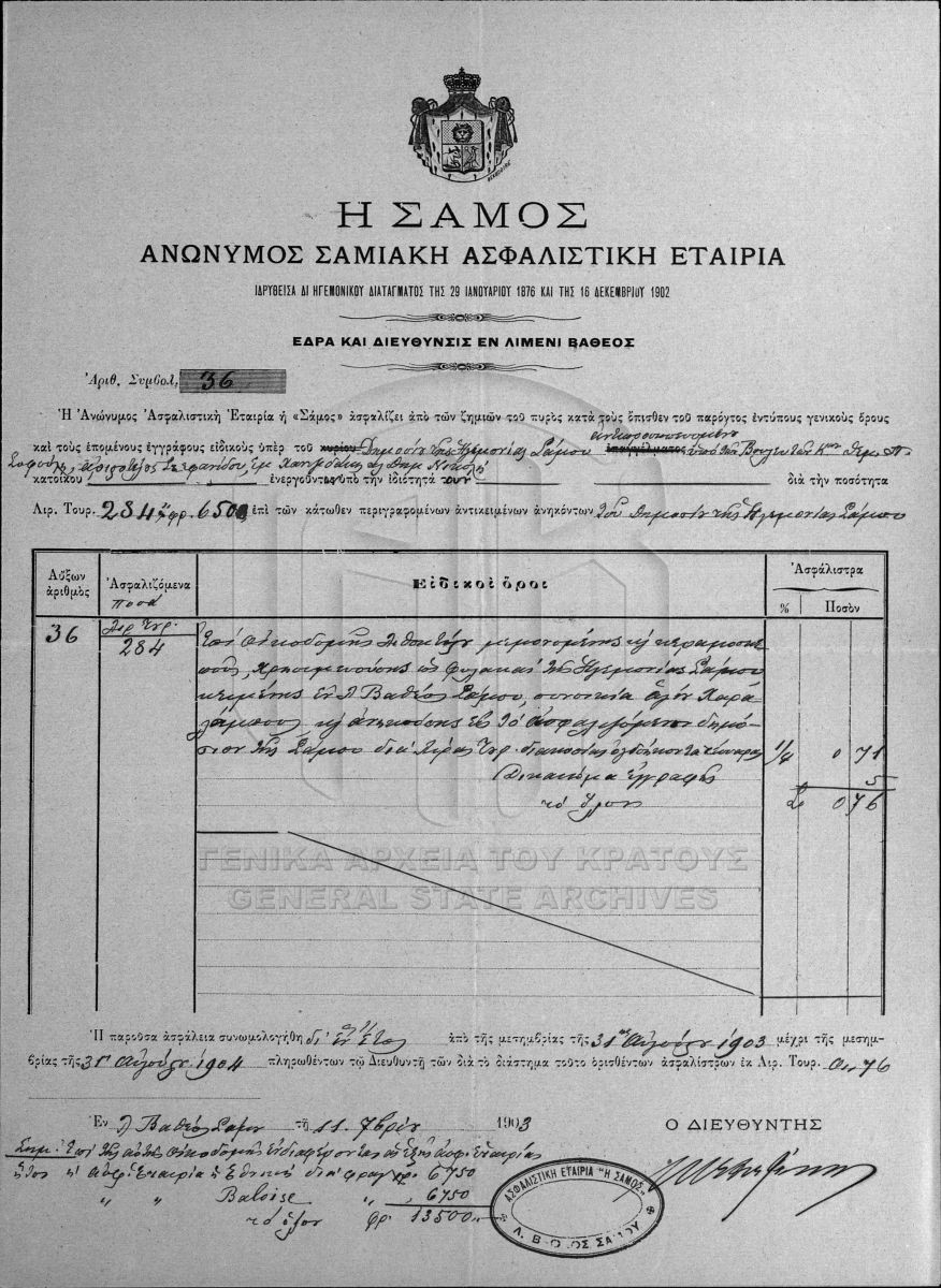 [Pièce] GRGSA-SAM_COL015.01.F000001.IT000169 Pièce #169 [11 Σεπτεμβρίου 1903] Ασφαλιστήριο της ασφαλιστικής εταιρείας «Σάμος» επί του κτιρίου των φυλακών της Ηγεμονίας. |