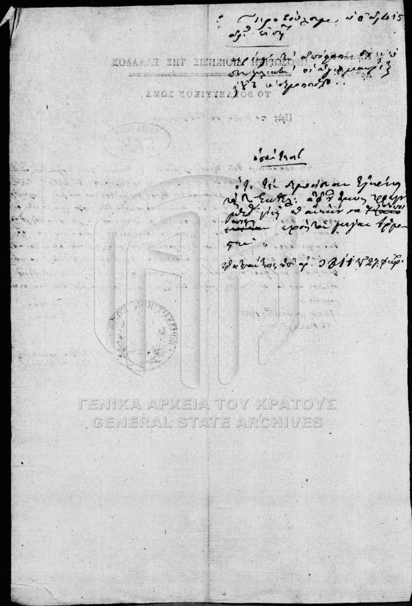 [File] GRGSA-CSA_PAA001.00.F000063 File #063 - Executive corps [1825] Περιέχει επίσημη αλληλογραφία, επιστολές, διατάγματα, διακηρύξεις, δηλώσεις, καταστάσεις λογαριασμών, αποδεικτικά, καταλόγους στρατιωτικώ... |