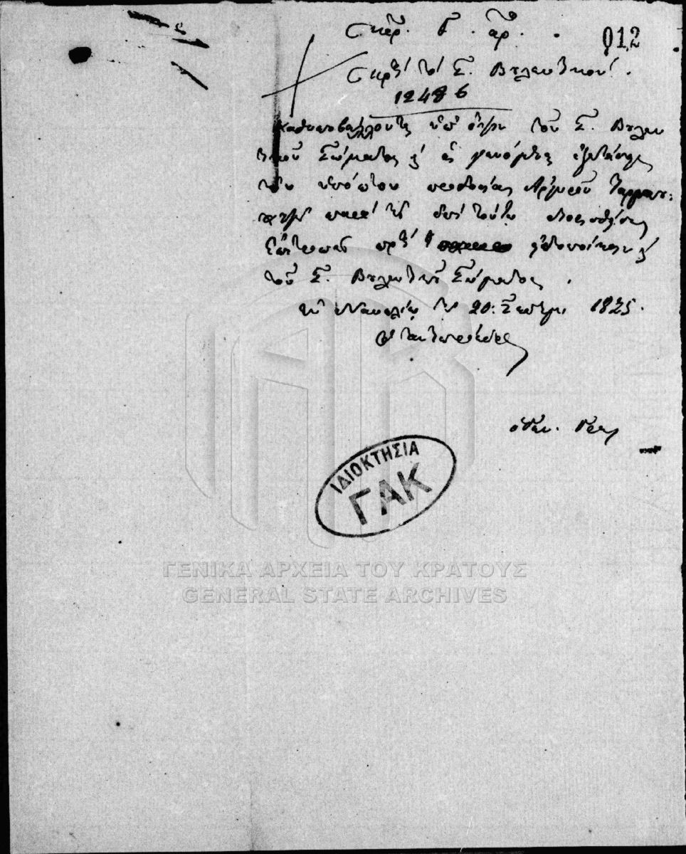 [Φάκελος] GRGSA-CSA_PAA001.00.F000122 Φάκελος #122 - Εκτελεστικόν [1825] Περιέχει επίσημη αλληλογραφία, επιστολές, διατάγματα, διακηρύξεις, δηλώσεις, καταστάσεις λογαριασμών, αποδεικτικά, καταλόγους στρατιωτικώ... |