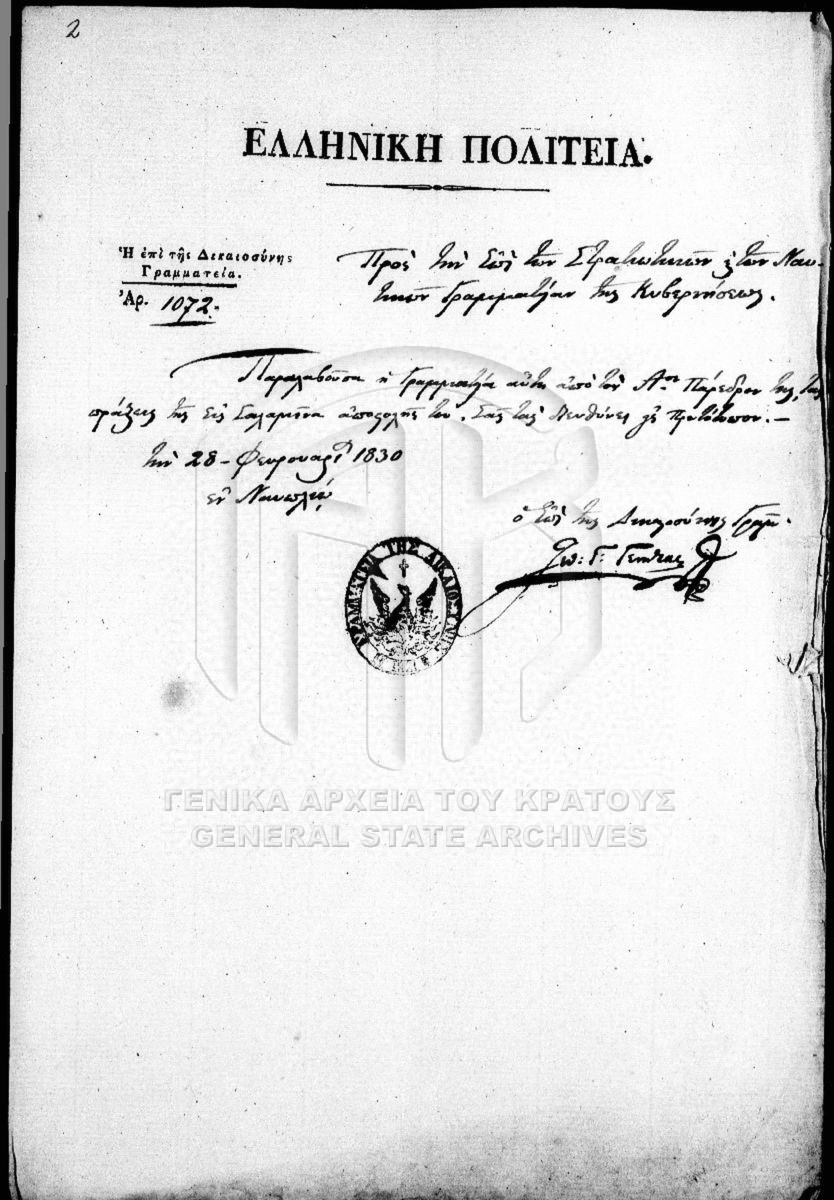 Υπηρεσιακή αλληλογραφία, επιστολές, διακηρύξεις, διατάγματα, κατάλογοι, καταστάσεις λογαριασμών, δηλώσεις, καταστάσεις ελέγχου στρατευμάτ...