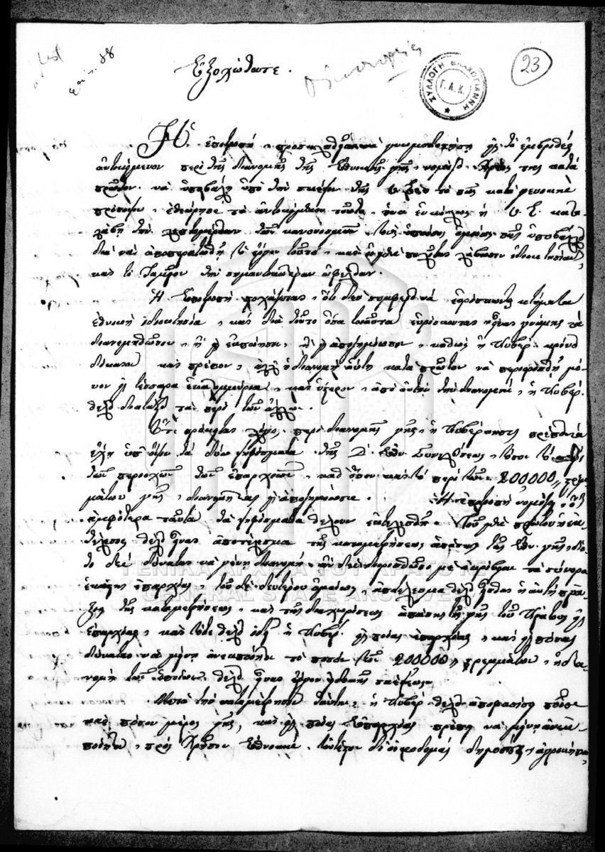 Περιέχει αλληλογραφία προς τη Γραμματεία της Επικρατείας και τον Κυβερνήτη, του Διοικητή Καλαμάτας και Νησίου, της Γερουσίας της Ελλάδος,...