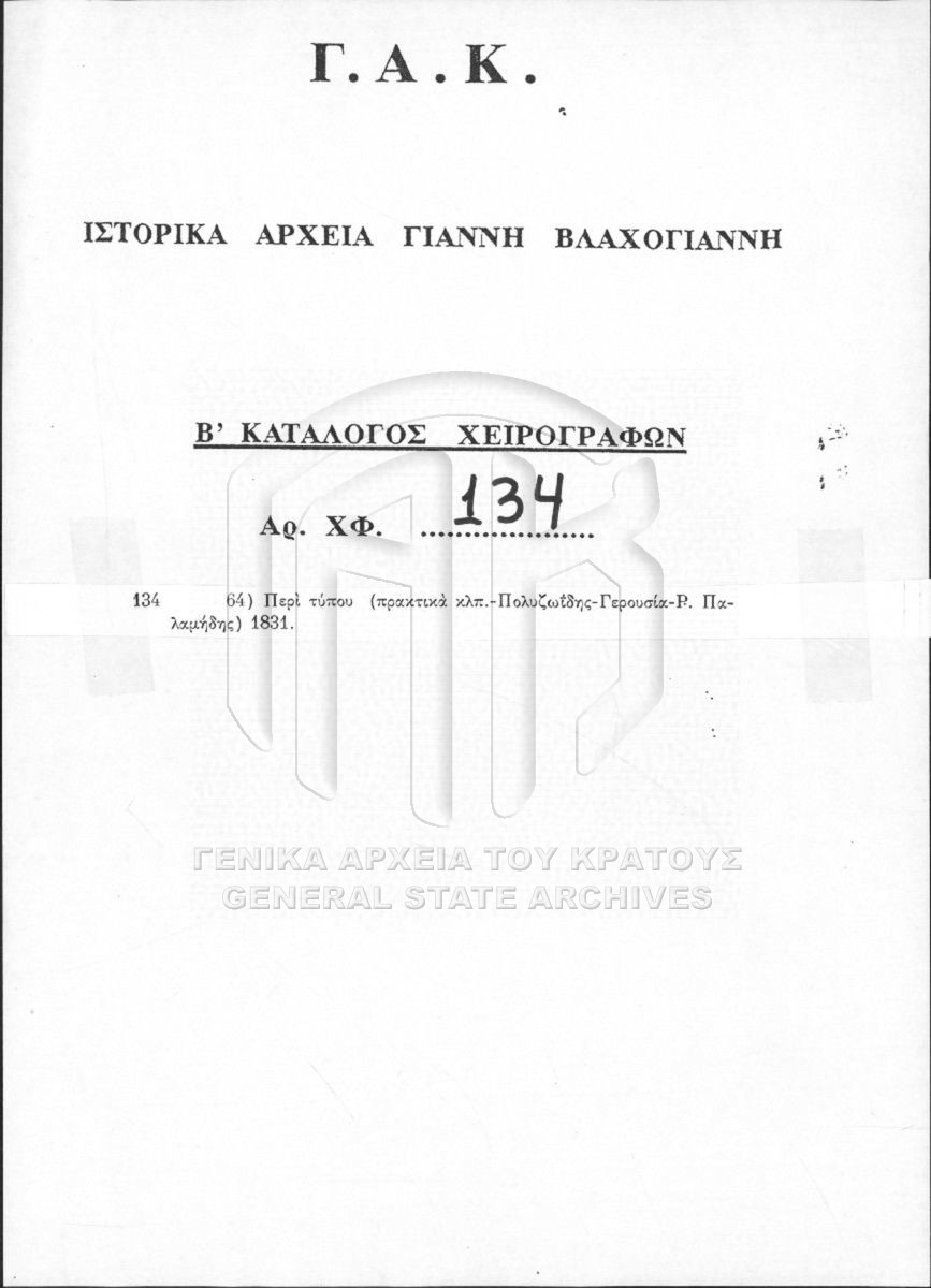 [Fichier] GRGSA-CSA_PCVLA.BMS.F000134 Fichier #134 - ΙΣΤΟΡΙΚΑ ΑΡΧΕΙΑ ΓΙΑΝΝΗ ΒΛΑΧΟΓΙΑΝΝΗ. Β' ΚΑΤΑΛΟΓΟΣ ΧΕΙΡΟΓΡΑΦΩΝ [1831] Περί τύπου. |